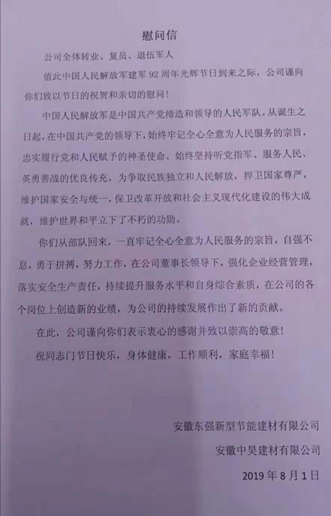 2019年8月1日迎來(lái)中國(guó)人民解放軍建軍92周年,公司全體領(lǐng)導(dǎo)、員工,向祖國(guó)最親愛的子弟兵致以衷心的祝福,同時(shí)向公司退伍軍人表達(dá)親切的慰問(wèn)。